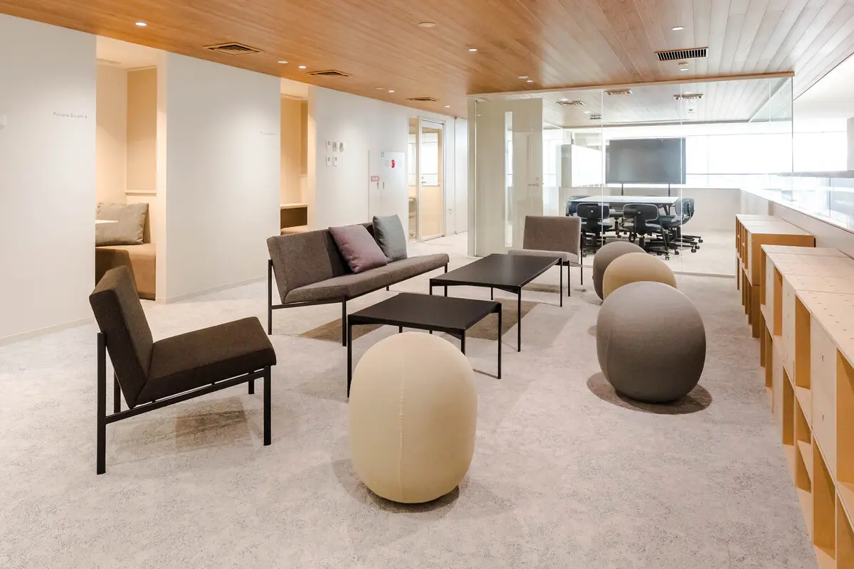 デスクワーク中心のプライベートエリアと、社外の方も利用できるパブリックエリアが同じフロアに共存しています。プライベートエリアでは、部門や役職の垣根を超えた対話が自然と生まれるよう、フリーアドレス制を導入。そして、機能の異なる2つのエリアを隣接させることで、多様な人々や情報が出会う、語り合いの場として、オープンイノベーションの起点になります。